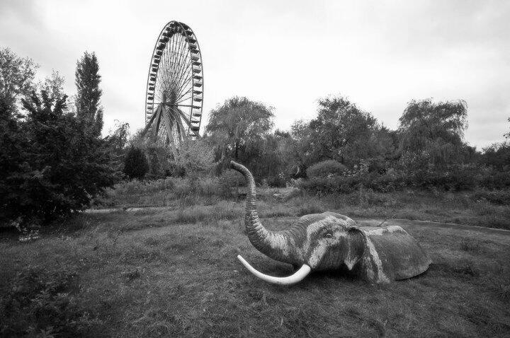 Once inside we managed to resist for a good 30 minutes, and explored the most impressive parts of the park such as the enormous ferris wheel [that can be spotted from far outside the park ] and the degraded and enormous statues of dinosaurs and elephants... after walking for a while we heard sounds of dogs barking in the distance and after a few minutes, two enormous security guards caught us [ a bit like a guards and thieves game ] and asked us in a severe tone in German to get the fuck out or they would call police.